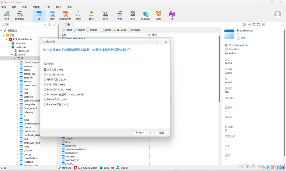 【提示】你可以拖拉一个支持格式的文件到表的对象选项卡,或到导航窗格中的一个模式。Navicat 将会自动弹出导入向导窗口。如果已高亮显示现有的表,Navicat 将会导入文件到已高亮显示的表。否则,它会导入文件到新的表。