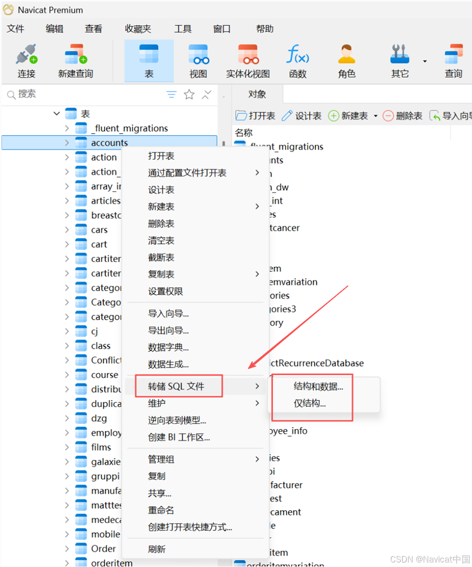 在主窗口中,右键单击已选择的某个表,然后选择“转储 SQL 文件” ->“仅结构”或“结构和数据”。
