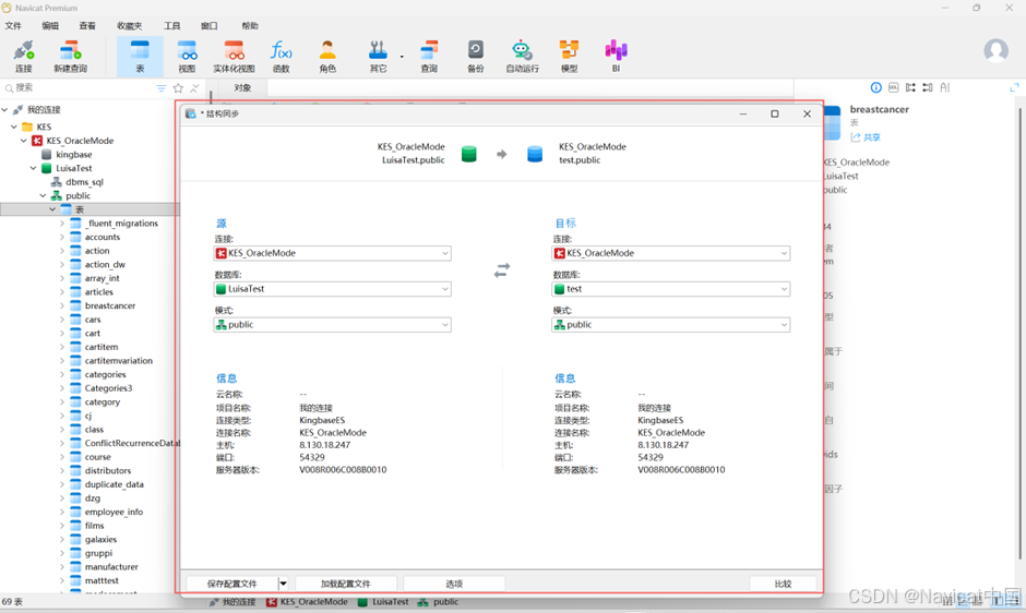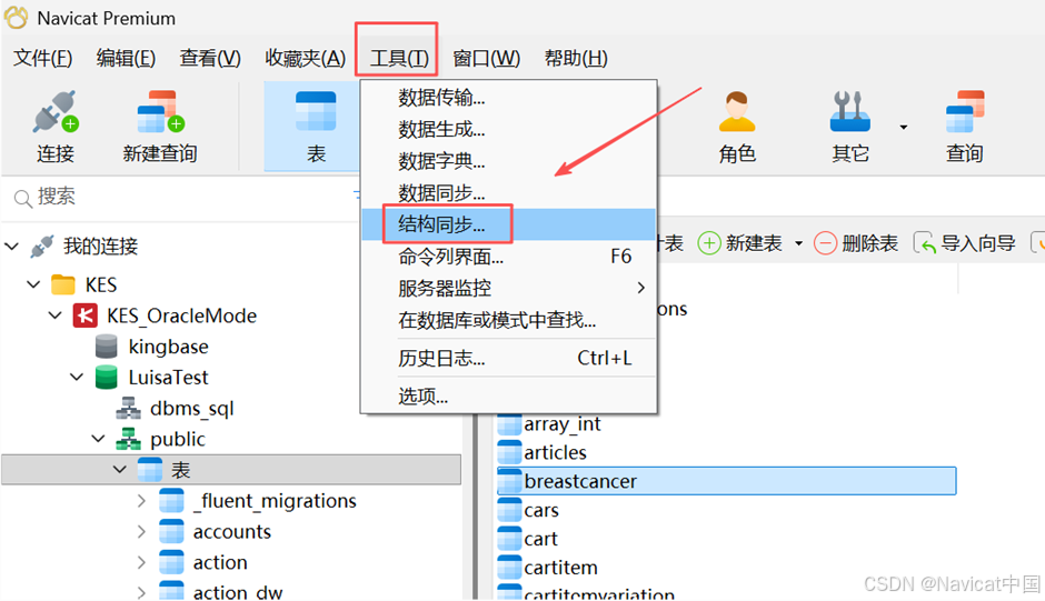 Navicat 让你以详细分析的进程比较和修改表的结构和其他对象。换句话说,Navicat 能比较两个数据库之间的对象并显示其结构的差异处。若要打开结构同步窗口,请从菜单栏选择“工具”->“结构同步”。