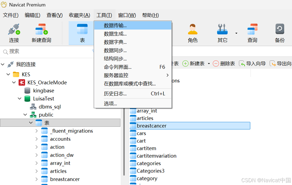 Navicat 让你从一个数据库传输对象到另一个数据库或 SQL 文件。目标数据库可以与源数据库的服务器相同或在其他服务器中。若要打开数据传输窗口,请从菜单栏选择“工具”->“数据传输”。