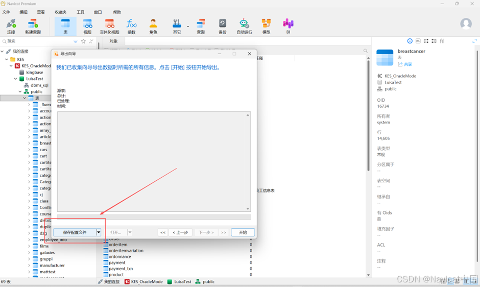 “导出向导”让你从表、视图或查询结果导出数据到任何可用的格式。你可以将设置保存为一个配置文件以供将来使用或用作设置自动运行任务。若要打开导出向导窗口,请在对象工具栏点击“导出向导”。