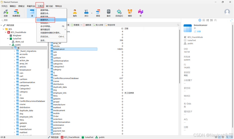 Navicat 让你以详细分析的进程从一个数据库传输数据到另一个数据库。换句话说,Navicat 能使不同模式的数据保持最新,以便每个库包含相同的信息。若要打开数据同步窗口,请从菜单栏选择“工具”->“数据同步”。