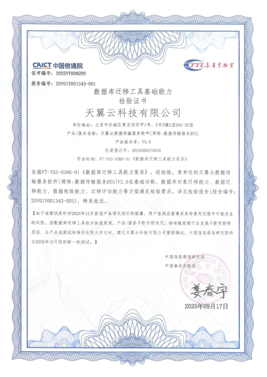 近日,天翼云数据传输服务软件(DTS)依据《数据库迁移工具能力要求》,结合天翼云TeleDB数据库产品,顺利通过中国信息通信研究院(简称“中国信通院”)“可信数据库”数据库迁移工具专项测试。测试结果表明,天翼云数据传输服务软件(DTS)在数据库迁移工具功能完备性、易用性、通用性等方面均符合标准要求。