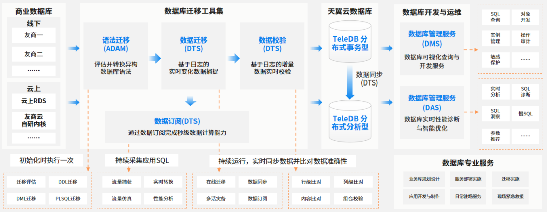 针对以上挑战,天翼云通过数据传输服务(DTS)与TeleDB数据库的结合,为企业打造了全链路的一站式数据迁移解决方案。作为天翼云数据库自主研发的新一代数据库在线迁移和数据同步产品,天翼云数据传输服务软件(DTS)集成数据库和应用迁移 (Advanced Database & Application Migration)语法转换工具,具备迁移评估、结构迁移、全量同步、增量同步、数据稽查、数据订阅六大功能,与TeleDB数据库高度兼容,形成完整的数据迁移解决方案,能够满足用户不停服数据迁移、数据异地灾备/双活、跨境数据同步、缓存更新等多种应用场景需求,为企业数字化转型提供强大支撑。
