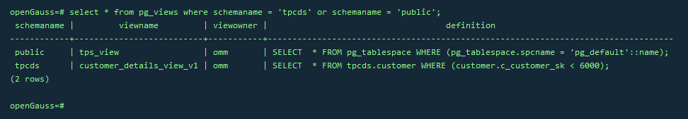 select * from pg_views where schemaname = 'tpcds' or schemaname = 'public';
