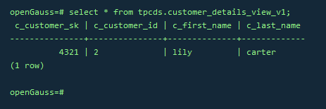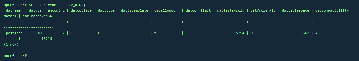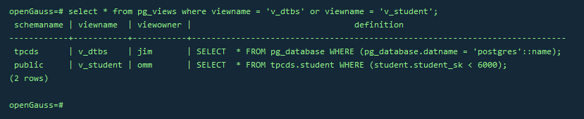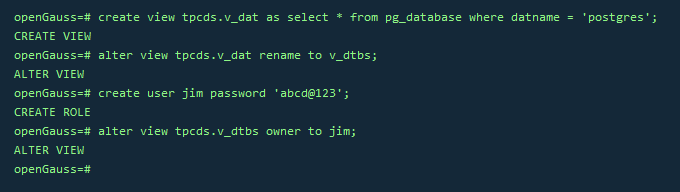 create view tpcds.v_dat as select * from pg_database where datname = 'postgres'; alter view tpcds.v_dat rename to v_dtbs; create user jim password 'abcd@123'; alter view tpcds.v_dtbs owner to jim;select * from tpcds.v_dtbs;