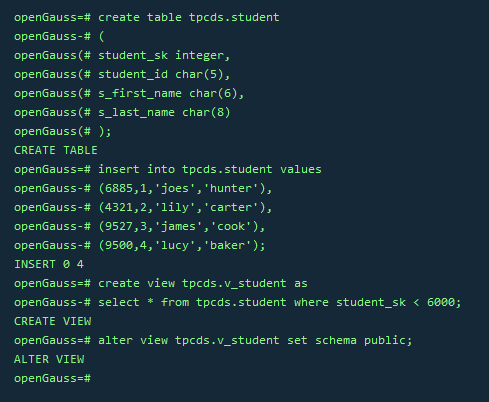 2.创建一个用户表student,并在用户表上创建视图,修改视图schema;