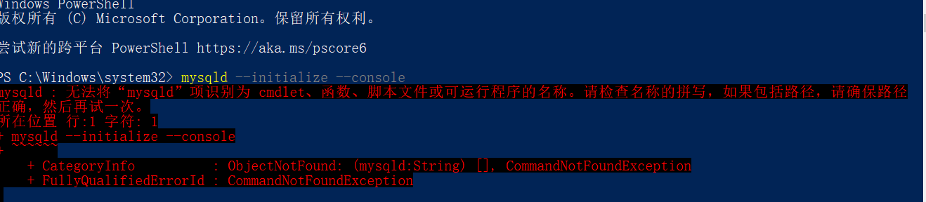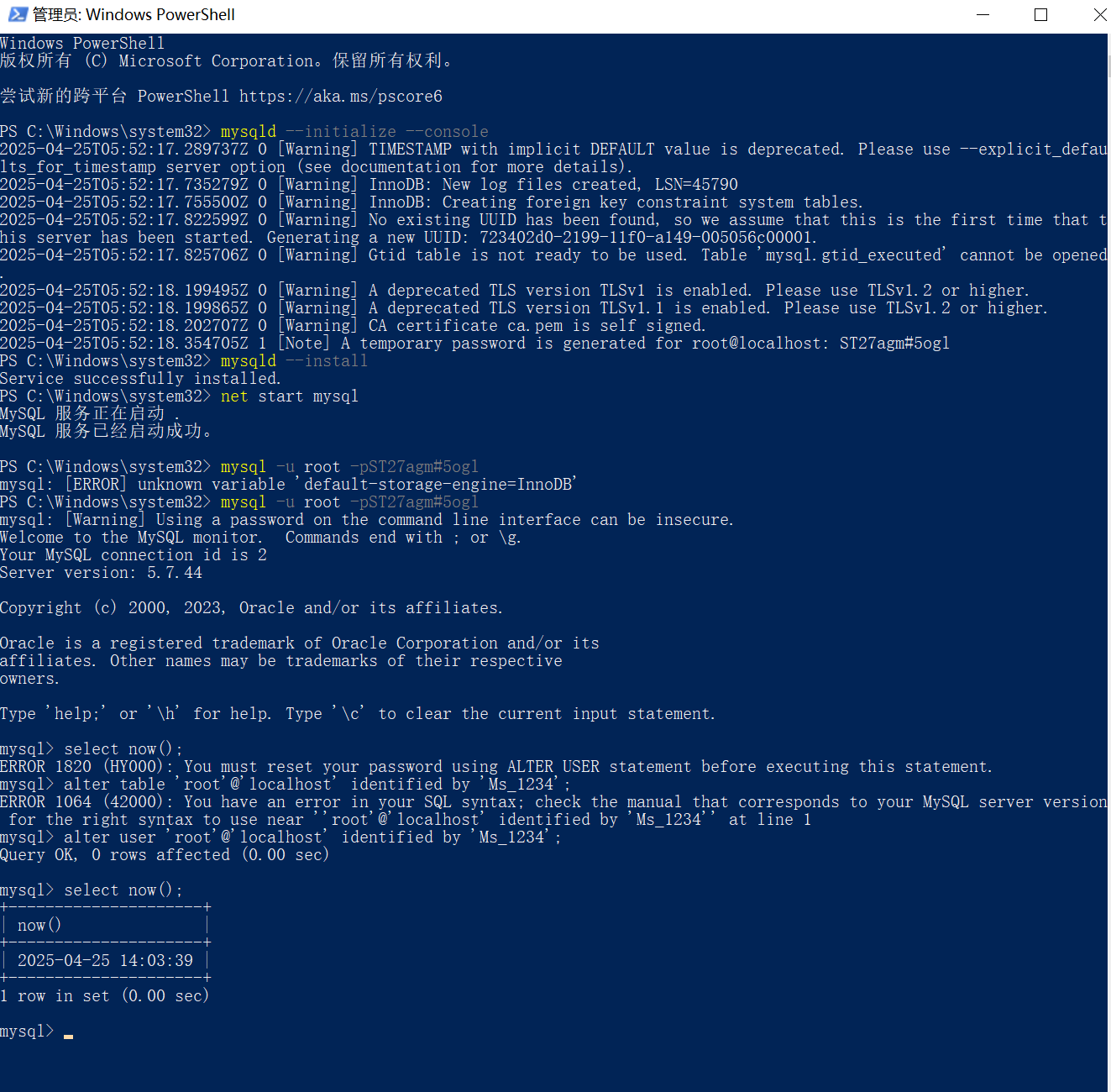 - 以管理员身份打开PC端软件PowerShell或者其他比如git-cmd客户端, 执行如下命令完成mysql初始化和安装