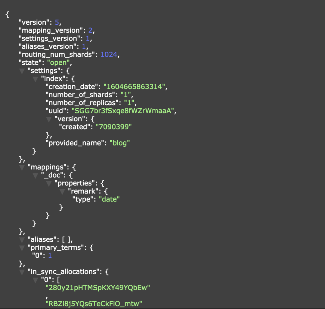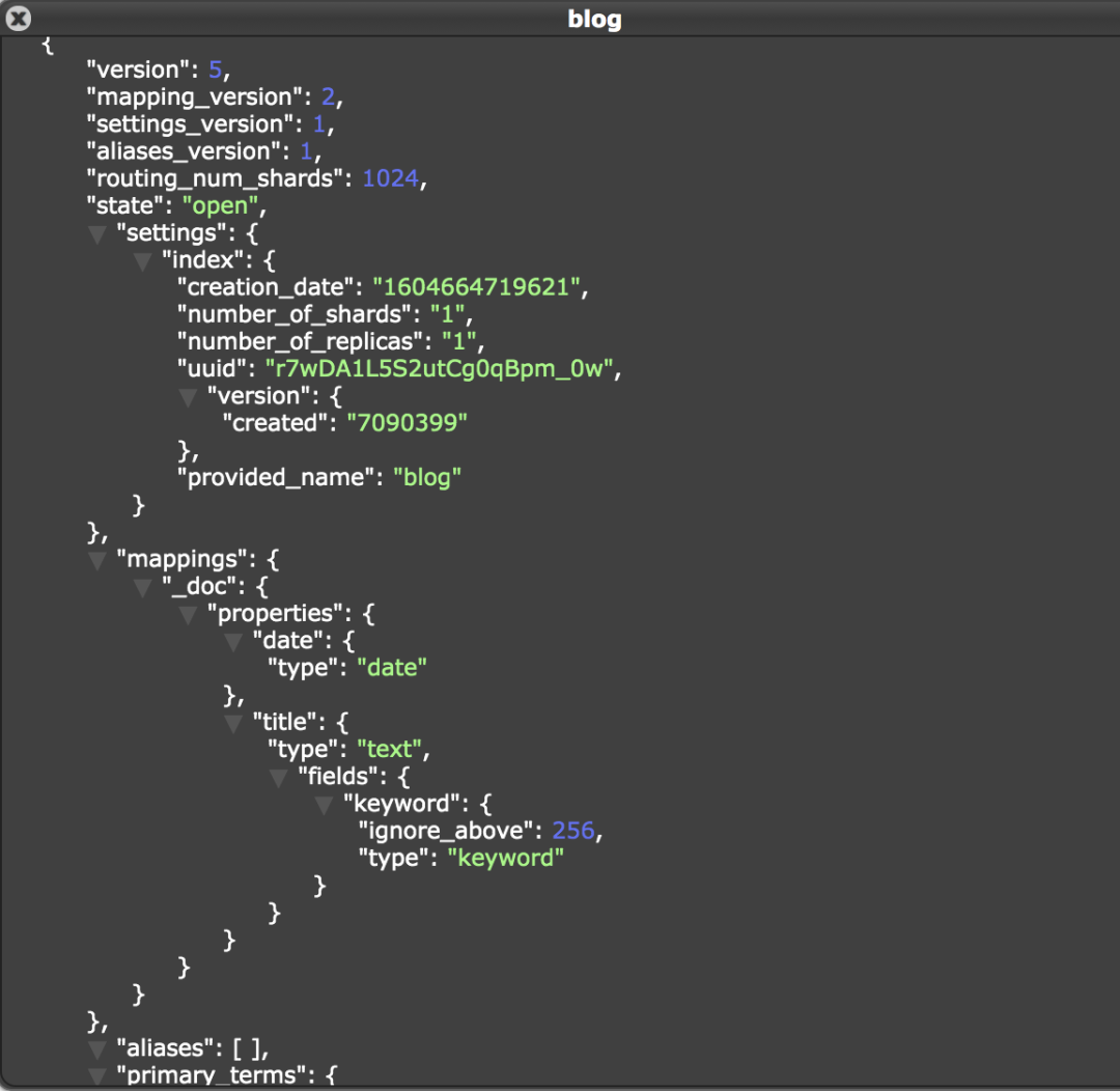 可以看到,date 字段的类型为 date,title 的类型有两个,text 和 keyword。