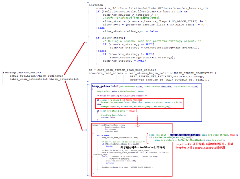 在heap_getnextslot函数中通过heapgettup_pagemode或者heapgettup来获取元组,这里以heapgettup为例,在一个while循环中通过heap_fetch_next_buffer获取一个内存页(将物理页加载到内存),然后在该内存页上依次向上返回元组。heap_fetch_next_buffer返回的是共享缓存BufferBlocks[]数组的序号。更深一层,由read_stream_next_buffer函数进行异步IO,并返回BufferBlocks[]数组的序号。