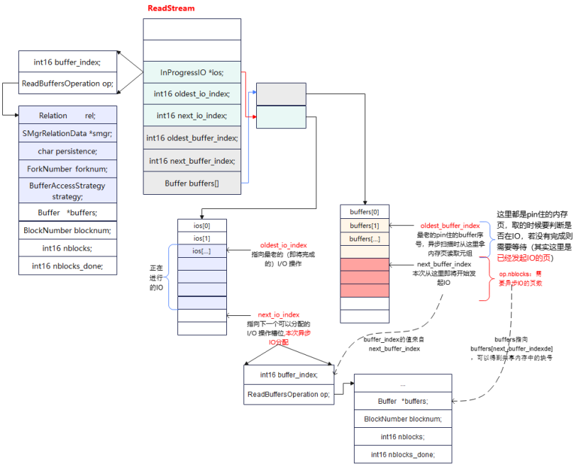异步读的时候主要依赖于ReadStream结构,该结构中主要通过InProgressIO ios[]和Buffer buffers[]两个循环队列来管理异步IO,其中buffers[]用来管理异步IO可以处理哪些数据页(一批),主要是连续页IO的数据页申请阶段;ios[]用来管理异步IO执行,主要是将buffers[]中的连续IO数据页作为一个IO申请,放到ios[]中进行处理,处于IO执行阶段。