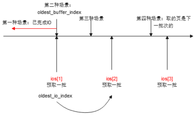3) 如果ios[].buffer_index == oldest_buffer_index,说明该批次IO还没有完成,则需要等待(下图第二中场景)。不相等的场景有三种:(1)如果取得oldest_buffer_index处于oldest_io_index前面,则已经完成IO,不用等待(下图第一种场景);(2)如果是该批次oldest_buffer_index后面的页,走到这里时条件不相等,但是第一个页的等待已经完成该批次所有页的IO了,所以可以不等(下图第三中场景),完成IO后会将olest_io_index向后进行推进;(3)如果ios[oldes_io_index]是取完页后后面发起的IO,说明前面的ios[前面]的IO都已经完成了,所以也可以不等。