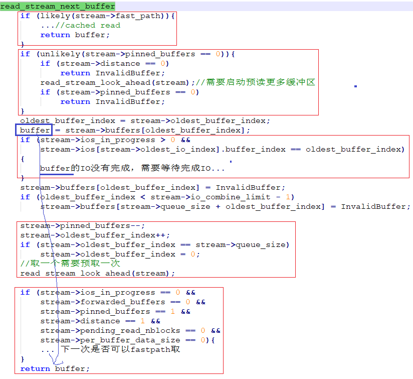 从stream->oldest_buffer_index处开始取内存数据页(前面已经发起了一个异步批量IO,已经讲数据页pin住了),ios[oldest_io_index].buffer_index == oldest_buffer_index时表示该页所处的批次IO还未完成,则等待IO完成。这里为什么使用这个条件,而不是检查oldest_io_index到next_io_index之间所有批次IO呢?