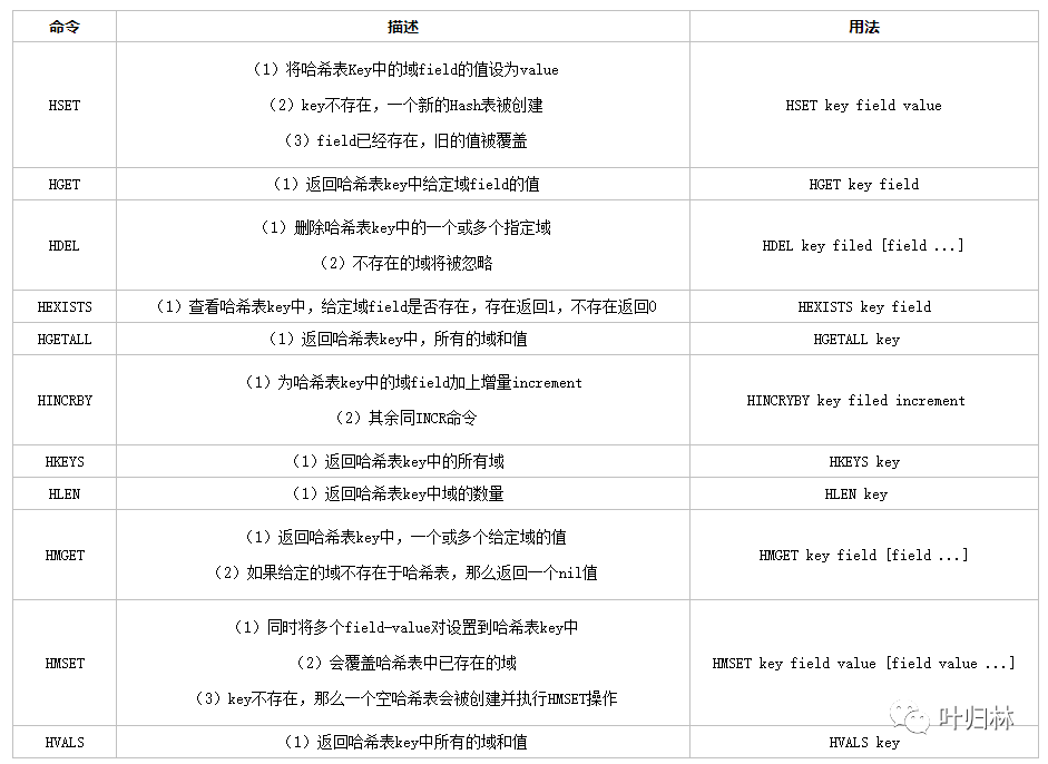hash 是一个键值对集合,是一个 string 类型的 key和 value 的映射表,key 还是key,但是value是一个键值对(key-value)。对应Java里面的 Map<String,Map<String,Object>> 集合