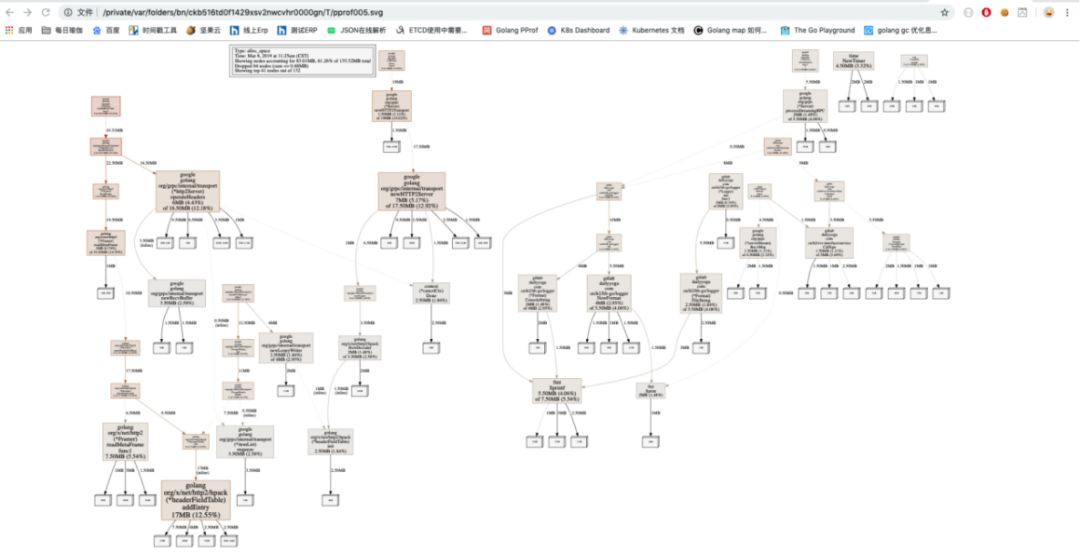 上一次优化只是简单的观察解决了goroutine泄漏的问题,这次要从程序运行过程中分配的堆内存查起。查看运行时间内堆上累计分配的内存,具体命令是:go tool pprof -alloc_space -cum http://localhost:port/debug/pprof/heap,使用-cum是累计函数调用栈的堆分配大小,图形会将调用栈很大的路线加粗标识出来。
