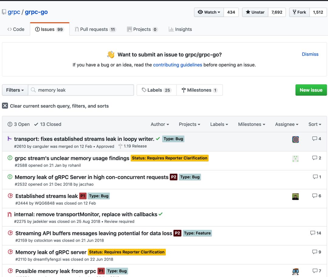 观察发现有多个地方堆内存分配的非常多:其中一个是双向流扩展包的,一个是IP、UID存储的地方。本着打破砂锅查到底的心态,直接在github上找到双向流的扩展包,看看是不是别人也遇到了双向流存在内存泄漏的问题,结果发现还真有: