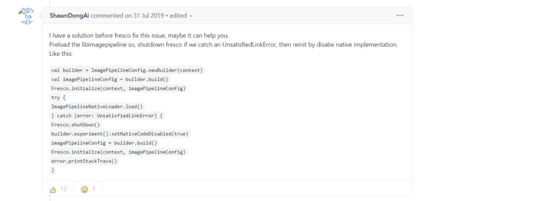 这位大佬说他有一个解决方案,并且给出了代码(虽然是Kotlin写的,但是我会告诉你我学过kotlin?)而且还点出了造成这个错误的原因是libimagepipeline.so文件,如果我们捕获到这个异常并尝试处理它就能解决这个问题,这和讨论的思路相同了,而且看到下面的点赞量,我立马想试试了。