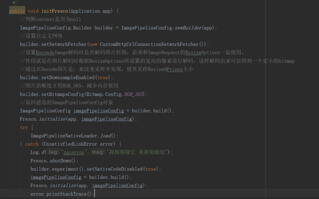// 获取ImagePipeline对象 Fresco的一些配置包括缓存策略及编码等等的配置就在这里面加载ImagePipeline mImagePipeline = Fresco.getImagePipeline();=================进入源码==================================/** Gets the image pipeline instance. */public static ImagePipeline getImagePipeline() {return getImagePipelineFactory().getImagePipeline();}//这一段都是初始化配置信息等等一些操作public ImagePipeline getImagePipeline() {if (mImagePipeline == null) {mImagePipeline =new ImagePipeline(getProducerSequenceFactory(),mConfig.getRequestListeners(),mConfig.getIsPrefetchEnabledSupplier(),getBitmapMemoryCache(),getEncodedMemoryCache(),getMainBufferedDiskCache(),getSmallImageBufferedDiskCache(),mConfig.getCacheKeyFactory(),mThreadHandoffProducerQueue,Suppliers.of(false),mConfig.getExperiments().isLazyDataSource());}return mImagePipeline;}此处省略若干方法,经过一系列的追踪private MemoryChunkPool getMemoryChunkPool(@MemoryChunkType int memoryChunkType) {switch (memoryChunkType) {case NATIVE_MEMORY:return getNativeMemoryChunkPool();case BUFFER_MEMORY:return getBufferMemoryChunkPool();default:throw new IllegalArgumentException("Invalid MemoryChunkType");}}可以看到 这地方了Fresco的缓存模式被分为了两种,一种是native层缓存 一种是磁盘缓存,我们进入它的native缓存调用的方法里面看看发生了什么public NativeMemoryChunkPool getNativeMemoryChunkPool() {if (mNativeMemoryChunkPool == null) {mNativeMemoryChunkPool =new NativeMemoryChunkPool(mConfig.getMemoryTrimmableRegistry(),mConfig.getMemoryChunkPoolParams(),mConfig.getMemoryChunkPoolStatsTracker());}return mNativeMemoryChunkPool;}这个方法返回了一个NativeMemoryChunkPool这东西,进去后发现public class NativeMemoryChunkPool extends MemoryChunkPool {public NativeMemoryChunkPool(MemoryTrimmableRegistry memoryTrimmableRegistry,PoolParams poolParams,PoolStatsTracker nativeMemoryChunkPoolStatsTracker) {super(memoryTrimmableRegistry, poolParams, nativeMemoryChunkPoolStatsTracker);}@Overrideprotected NativeMemoryChunk alloc(int bucketedSize) {return new NativeMemoryChunk(bucketedSize);}}它的alloc方法调用了nativeMemoryChunk 看着名字我们就怀疑它就是初始化ImagePipelineNativeLoader.load()的地方,进去后果不其然/*** Wrapper around chunk of native memory.** <p>This class uses JNI to obtain pointer to native memory and read/write data from/to it.** <p>Native code used by this class is shipped as part of libimagepipeline.so @ThreadSafe*/@DoNotStrippublic class NativeMemoryChunk implements MemoryChunk, Closeable {private static final String TAG = "NativeMemoryChunk";static {ImagePipelineNativeLoader.load();}/*** Address of memory chunk wrapped by this NativeMemoryChunk*/private final long mNativePtr;}