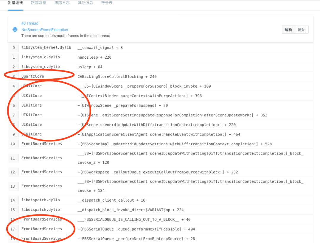 从图中可以看出,最后卡顿在了QuartzCore库的CABackingStoreCollectBlocking函数上。