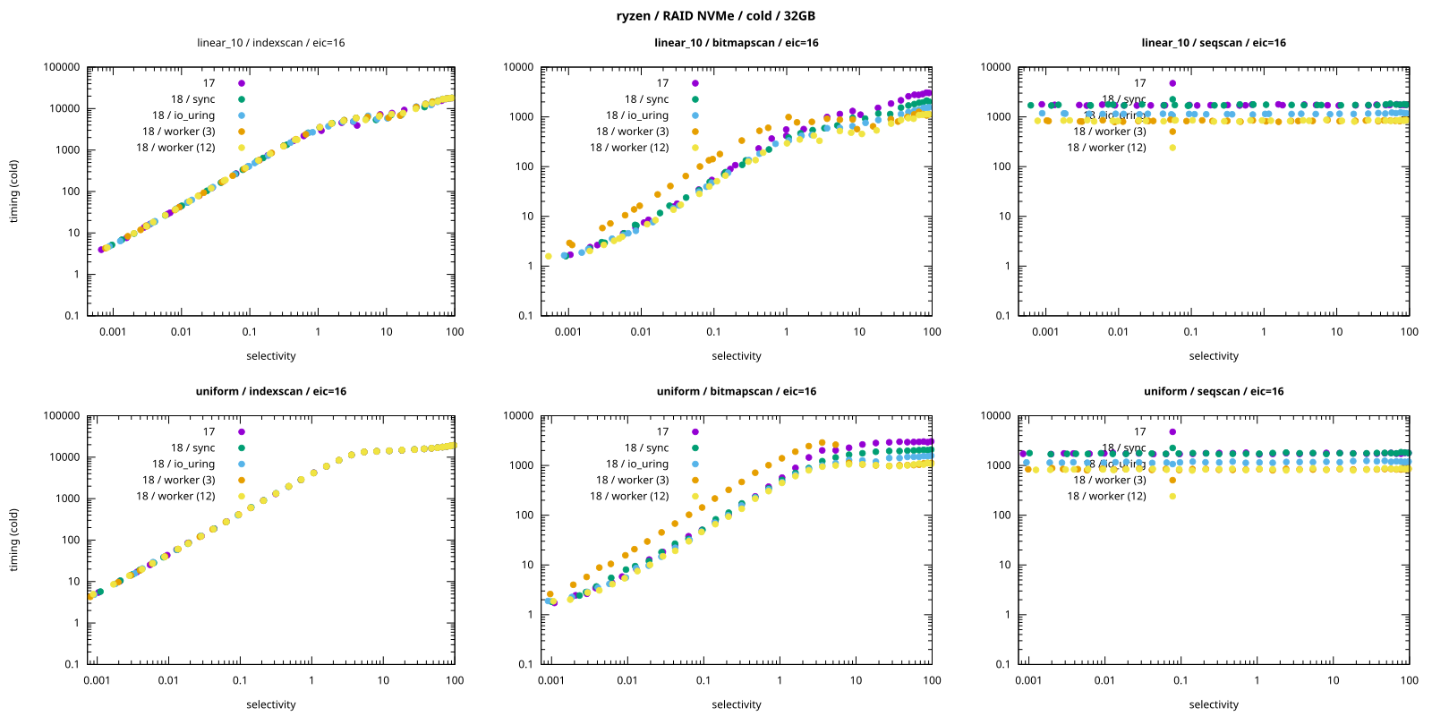 实际上,我可以通过一个基准测试的结果来证明这一点,这个测试是我为选择 io_method 默认值而进行的。该基准测试生成了一个合成数据集,然后运行匹配部分数据的查询(同时强制使用特定的扫描类型)。
