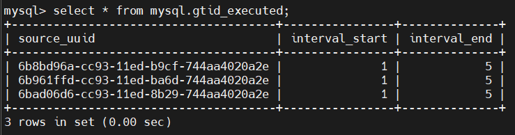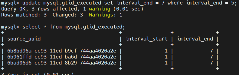 • 以三个分片为例, CDC 回放完三个分片的 GTID 集合均为 1-5,想要在不清理 binlog 的情形下,实现从 8 开始回放,具体步骤如下: CDC 所在用户下执行 dbmoni -stop;mysql.server start; 连上 CDC ,查询表mysql.gtid_executed;