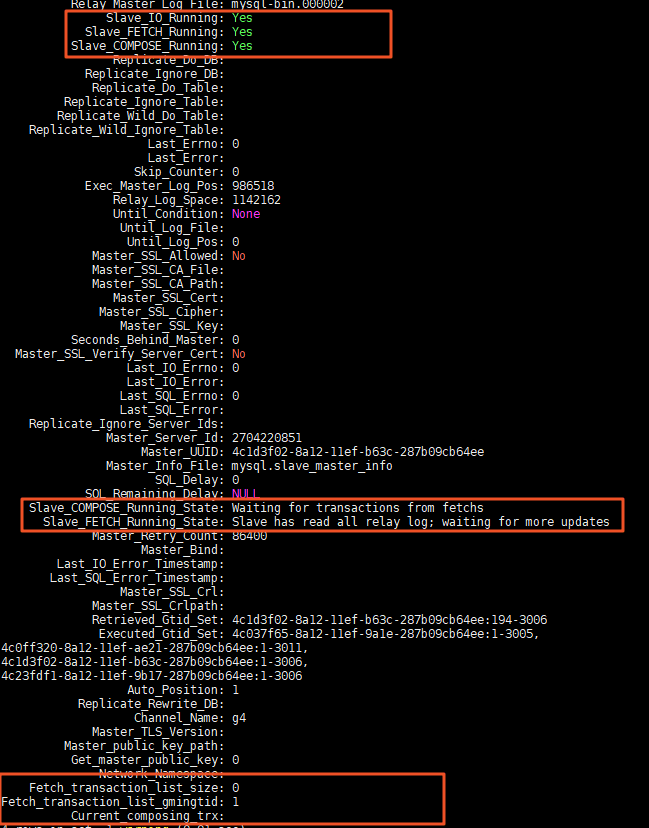 • Slave_COMPOSE_Running COMPOSE 线程是否启动。YES 表示已启动;NO 表示关闭