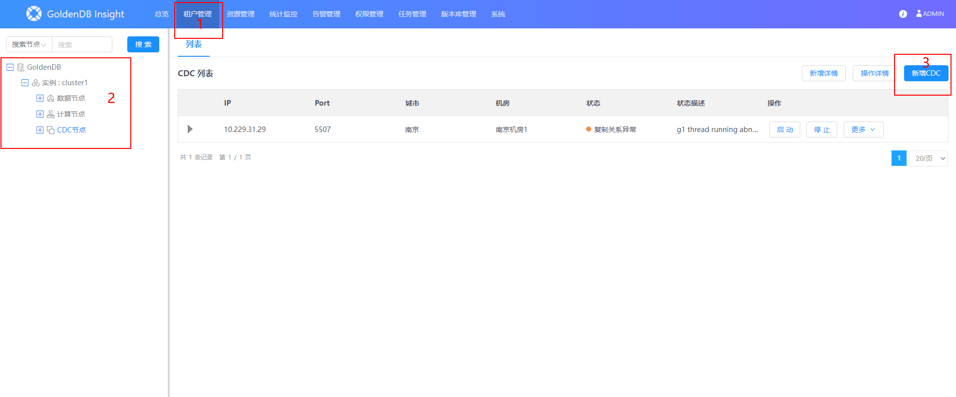 1. insight 页面新增 CDC ,在租户管理 > 集群 > CDC 节点,点击页面左上方的新增按钮。