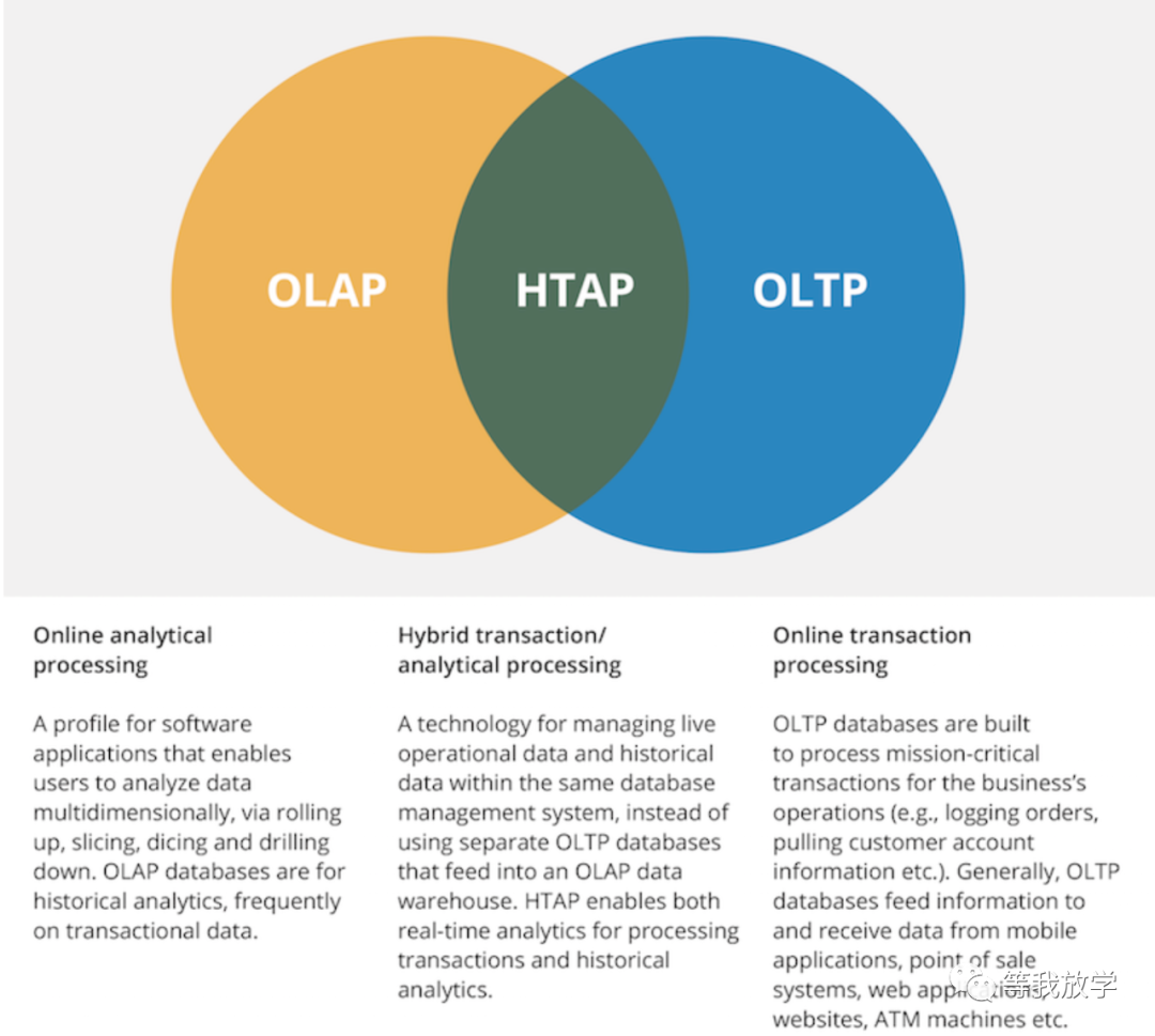 HTAP(Hybird transaction/analytical processing,混合事务和分析处理)架构的提出源自Gartner2014年的一篇文章,文章认为HTAP使用内存计算技术作为其核心架构,可以提高业务的态势感知能力,并通过改进业务的敏捷性进行创新。简单来说,HTAP打破了OLAP和OLTP的隔阂,既可以运用于事务型场景,也可以运用于分析型场景,实时实现业务决策。