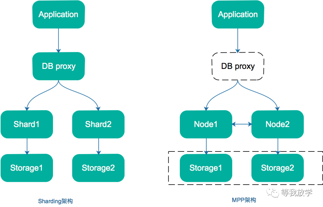Sharding架构需要一个proxy角色,用于执行分布键拆分、数据路由、结果聚合等操作,每个节点独立存储和计算后把结果汇总给proxy返回应用端;MPP架构中,应用端可以使用proxy进行sql作业分发,也可以直接访问计算节点提交作业。计算节点资源独立,不依赖于master进行数据汇总,数据存储可以独立存储,也可以用分布式共享存储。