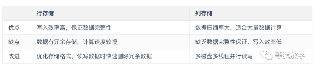 传统的数据库存储模式中,有两种存储方式:行式存储和列式存储。行式存储主要是OLTP的系统,列式存储主要是OLAP的系统。其对比特点如下表所示: