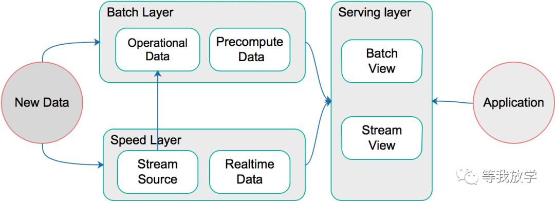 Lambda架构是由Storm的作者Nathan Marz提出的一个实时大数据处理框架,大致分为三层:Batch Layer(批处理层)、Speed Layer(实时处理层)和Serving Layer(服务层);批处理层主要用于存储数据,数据清洗和构建模型,多处理离线数据;实时处理层处理增量数据,并不断merge数据到Batch Layer;数据服务层提供数据的查询结构,方便用户查询。Lambda架构的全景图如下:
