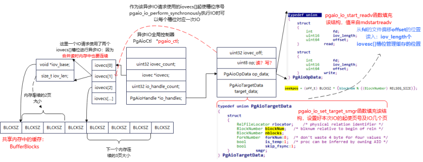 3)PgAioOpData op_data对应本次IO读文件的元数据:以读为例,fd为文件句柄,iov_length为iovecs[]使用的槽位个数,offset为fd文件的偏移位置开始读。读的时候取到对应的iovecs[],从而得到iov_len读取长度。