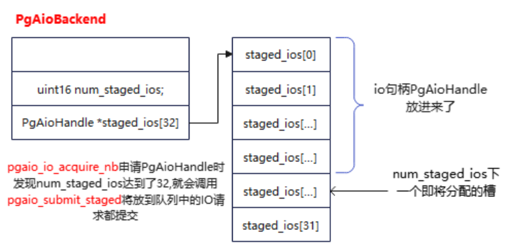3) 由pgaio_io_stage将异步IO句柄放到staged_ios[]中