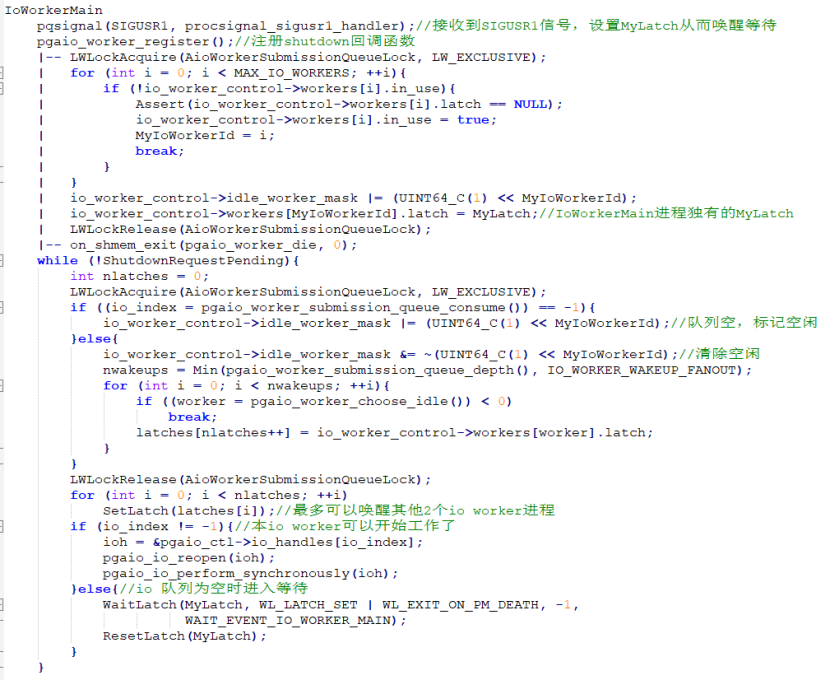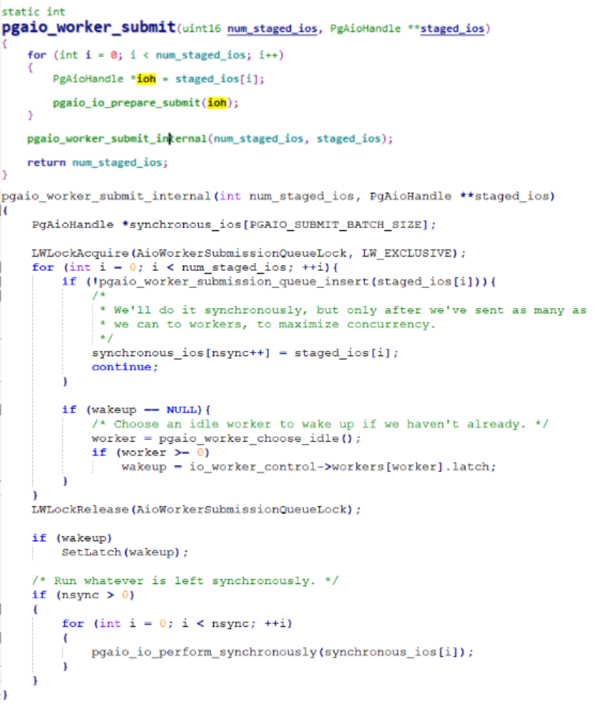 该进程在WaitLatch处被唤醒后,在队列锁内取出一个io句柄进行同步IO的执行;可以看到它还会选择其他空闲的io worker进程将其唤醒。也就是做到多个IO worker并发消耗提交队列的IO请求进行IO。