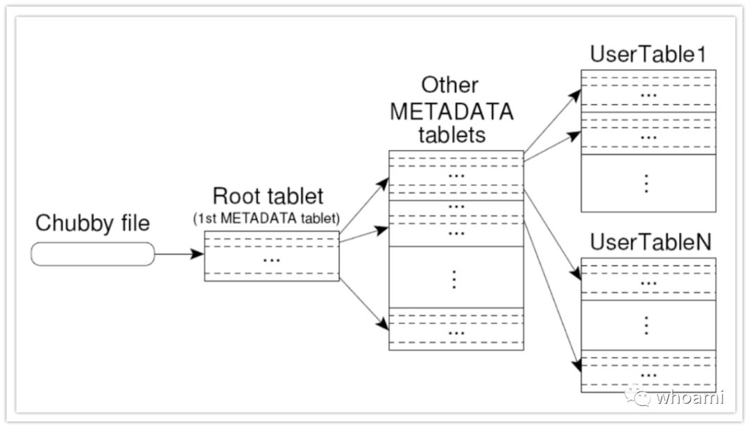 存储tablet位置信息使用类似三层b+树架构。