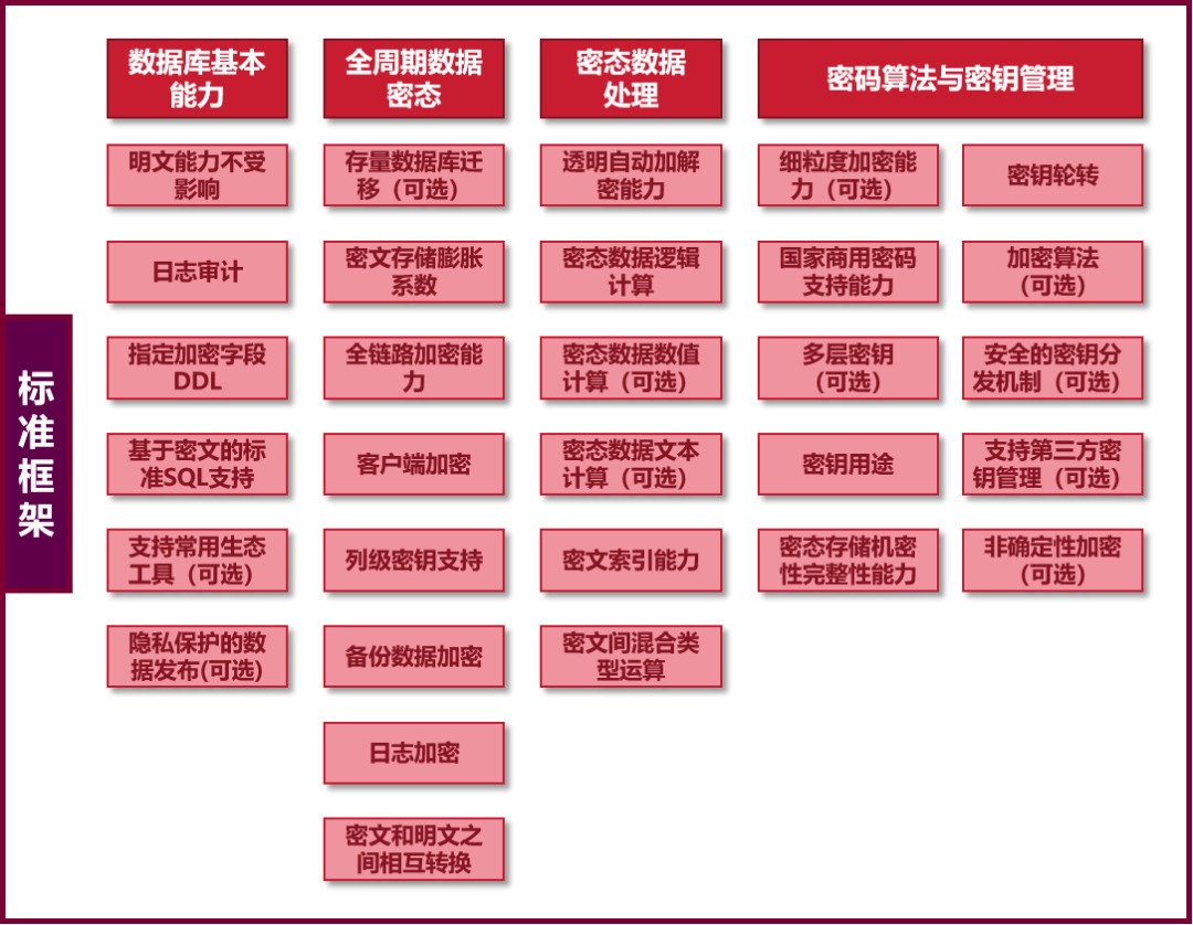 《全密态数据库技术要求》(T/CCSA 571-2024)标准包含数据库基本能力、全周期数据密态、密态数据处理以及加密算法与密钥管理四大能力域,共计30个测试项,为全密态数据库产品的研发、测试以及选型提供了有力参考。本标准也是业内首个全密态数据库产品标准。