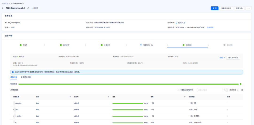 在正式割接前,可在 Action OMS 中随时发起新一轮的数据一致性校验,确保源端与目标端数据完全同步。同时,业务团队可接入目标数据库,进行完整的功能验证。