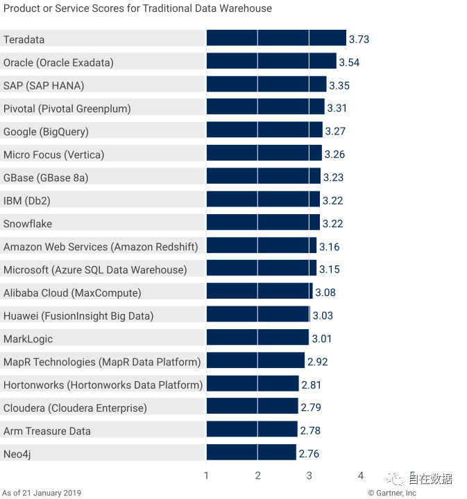 2019年,Garnter发布了2019数据分析管理产品和解决方案(Data Management Solution for Analytics,DMSA)行业报告。在报告中,Gartner从多个角度的12项关键指标中分析了19款重量级产品,Greenplum大数据平台排名跃居第四位,比2018年有了巨大的提升(2018年排名第9位),其他产品基本都经过长达40多年的发展,相比之下,Greenplum还处于青少年时期,发展更为快速。Greenplum是全球十大经典和实时数据分析产品中唯一的开源数据库。