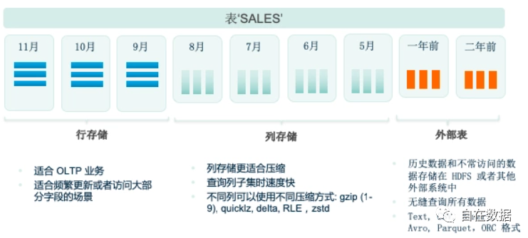 Greenplum可以对同一张表的不同分区采用不同的存储模式,常用的划分标准是根据时间划分分区。比如上图的例子中,最老的数据,也就是不常访问的数据可以使用外部表的模式,中间的数据可以使用列存储,频繁更新或者访问的数据可以用行存储。多态存储对用户透明。