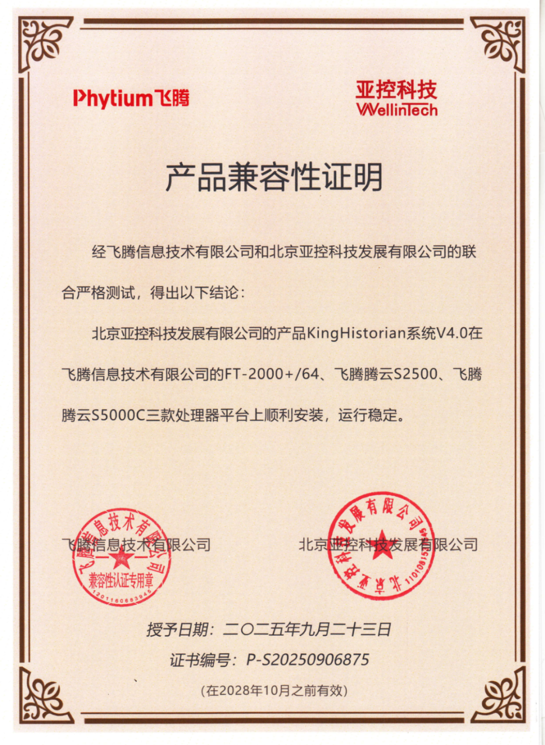 经过双方一系列全面严谨的认证测试后,双方认定亚控科技KingHistorianV4.0信创版与飞腾信息技术有限公司的FT-2000+/64、飞腾腾云S2500、飞腾腾云S5000C完成兼容性测试,能够达到通用兼容性要求及可靠、稳定、高性能运行要求,满足用户的关键性应用需求。