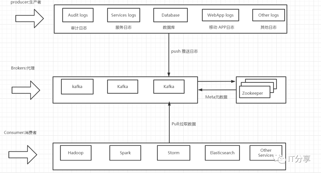 2、生产者负责写入消息数据,将审计日志,服务日志,数据库,移动APP日志,以及其他类型的日志主动推送到Kafka集群进行存储。