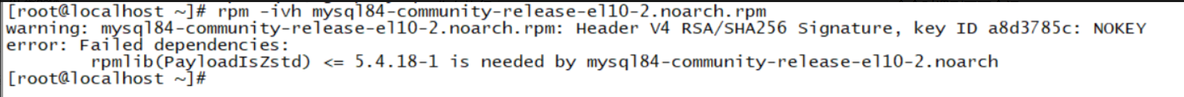 这个错误表明要安装的 mysql84-community-release-el10-2.noarch.rpm 包依赖于 rpm-lib(PayloadIsZstd) 的特定版本(<= 5.4.18-1),但当前系统中安装的 rpm-lib 版本不满足这个要求,导致安装失败。
