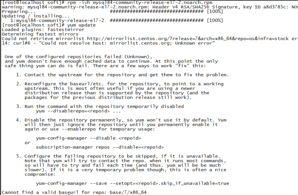 ⚠️⚠️⚠️⚠️⚠️⚠️如果还是没解决并出现了如图所示的问题,那么就是因为CentOS 7 已经停止技术支持,官方源可能不再提供服务 ,导致yum无法获取到更新信息。