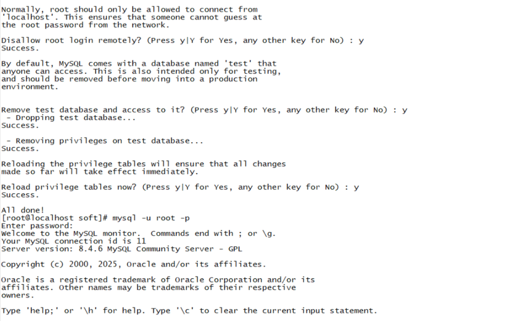Remove anonymous users?、Disallow root login remotely?等),直接按y并回车即可,这是推荐的安全设置。
