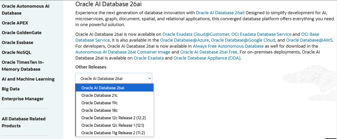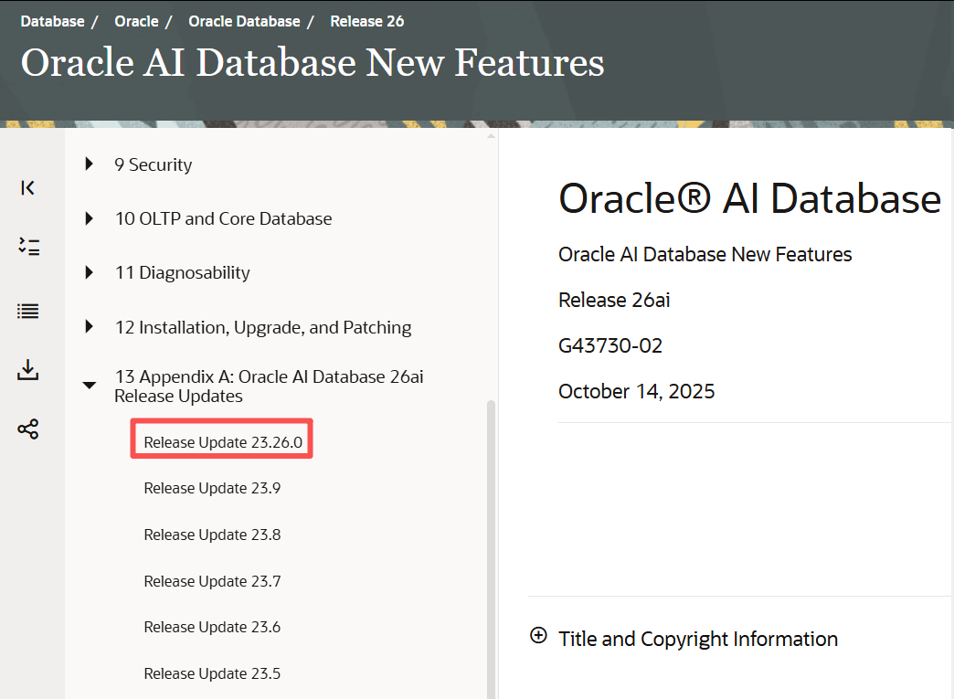 Release Schedule of Current Database Releases (Doc ID 742060.1)https://docs.oracle.com/en/database/oracle/oracle-database/index.htmlhttps://docs.oracle.com/en/database/oracle/oracle-database/26/nfcoa/index.htmlhttps://blogs.oracle.com/database/post/oracle-announces-oracle-ai-database-26aihttps://www.oracle.com/news/announcement/ai-world-database-26ai-powers-the-ai-for-data-revolution-2025-10-14/