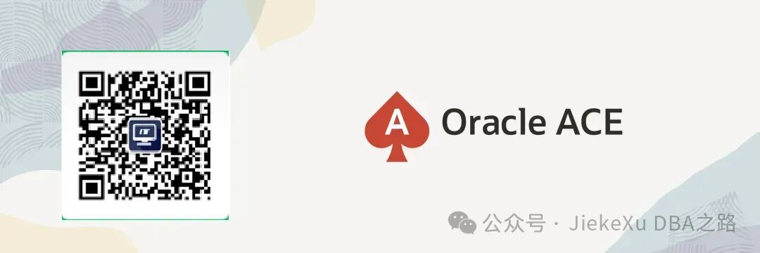 大家好,我是JiekeXu,江湖人称“强哥”,青学会MOP技术社区联合创始人,荣获Oracle ACE Pro称号,金仓最具价值倡导者KVA,崖山最具价值专家YVP,IvorySQL开源社区专家顾问委员会成员,墨天轮MVP,墨天轮连续多年年度“墨力之星”,拥有Oracle OCP/OCM认证,MySQL 5.7/8.0 OCP认证以及金仓KCP、KCM、KCSM,PCTA等众多国产数据库认证证书。欢迎点击下方“JiekeXu DBA之路”公众号名片可关注我的微信公众号,然后点击右上方三个点“设为星标”置顶,更多干货文章才能第一时间推送给你!后台回复【加群】,添加我个人微信拉你进群一起交流学习。