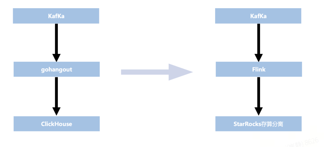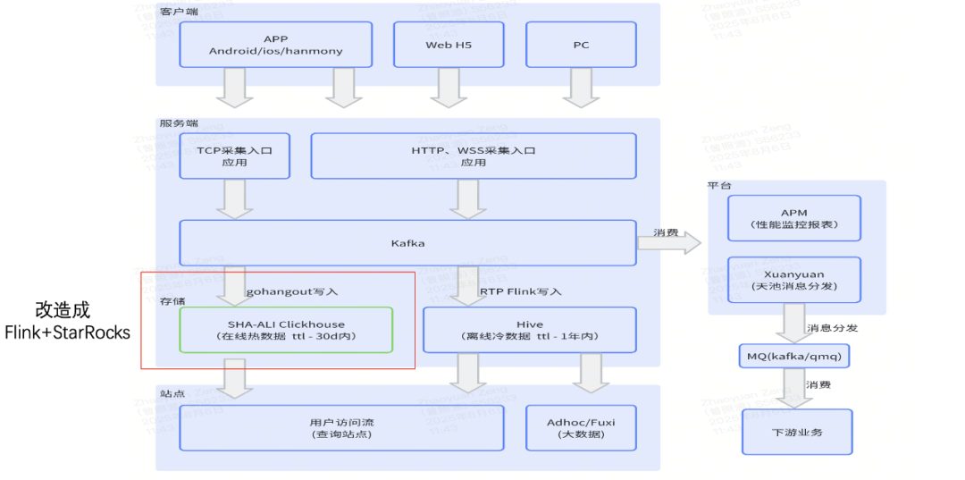 本次改造的重点在于上图中红色框标注部分——即 gohangout + ClickHouse,最终将其替换为 Flink + StarRocks。