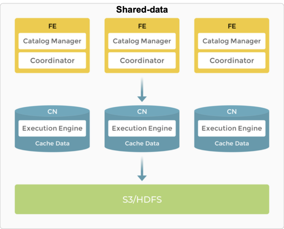 因此,StarRocks 进一步演进为存算分离架构:计算节点无状态化,仅保留计算引擎,能够根据业务需求灵活调度;存储则托管于远端对象存储(OSS/S3),实现计算与存储的彻底解耦,另外为了保证查询速度,计算节点可以打开 DataCache。该架构既提升了资源利用率,避免资源浪费,又显著降低了存储成本,同时也保证了查询速度。例如,相比存算一体架构下的三副本冗余,存算分离模式仅需一份本地副本即可保障可靠性。