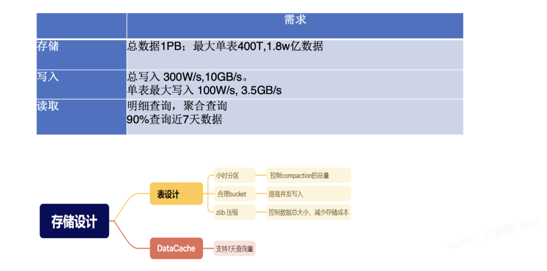 表设计上采用小时级分区。由于写入量极大,小时分区能够有效控制每次Compaction 时的数据量。同时,将 Bucket 数设置为 128,以提升并发写入能力。在压缩格式方面,选择了 zlib 替代 LZ4,能够在保证性能的前提下节省约 30% 的存储空间,显著降低总体存储成本。