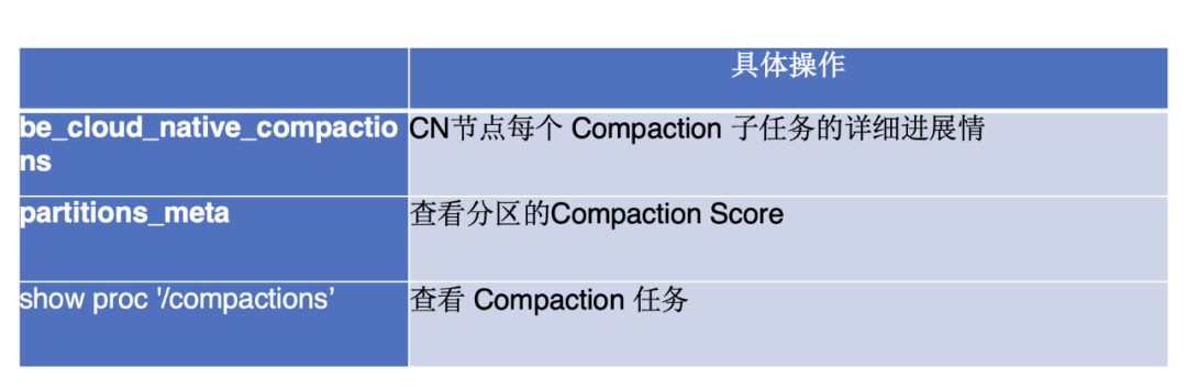 此外,利用 show proc compactions 命令,可以获取具体的 Compaction 任务信息,包括任务的开始与结束时间、总执行时长,以及本地与远端数据的扫描量。例如,当远端数据的扫描量偏高时,往往提示需要检查 DataCache 的配置是否过小,从而为性能优化提供参考。